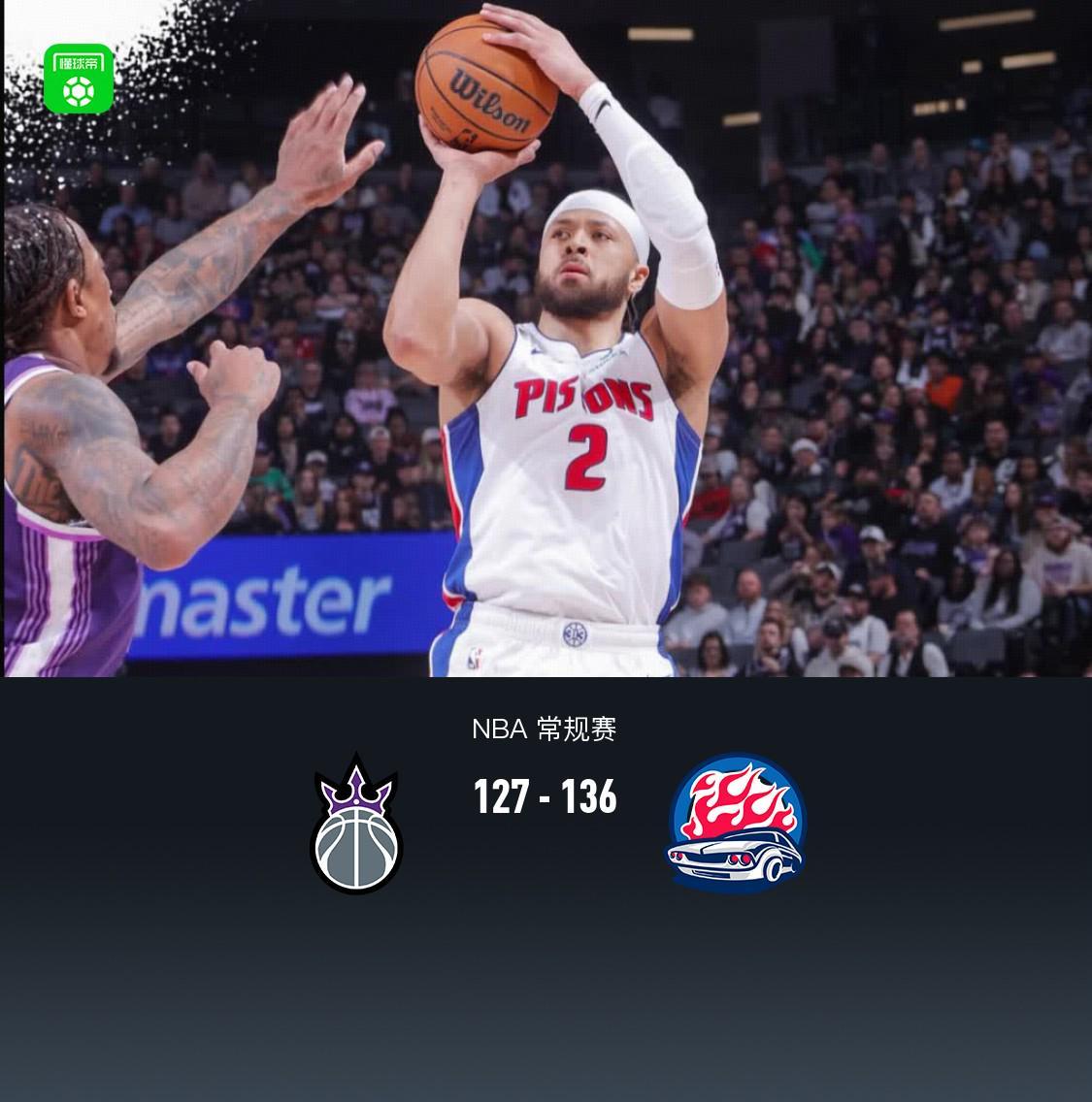 第四节国王威斯布鲁克拿下10分,活塞坎宁安拿下6分,最终国王127-136不敌活塞