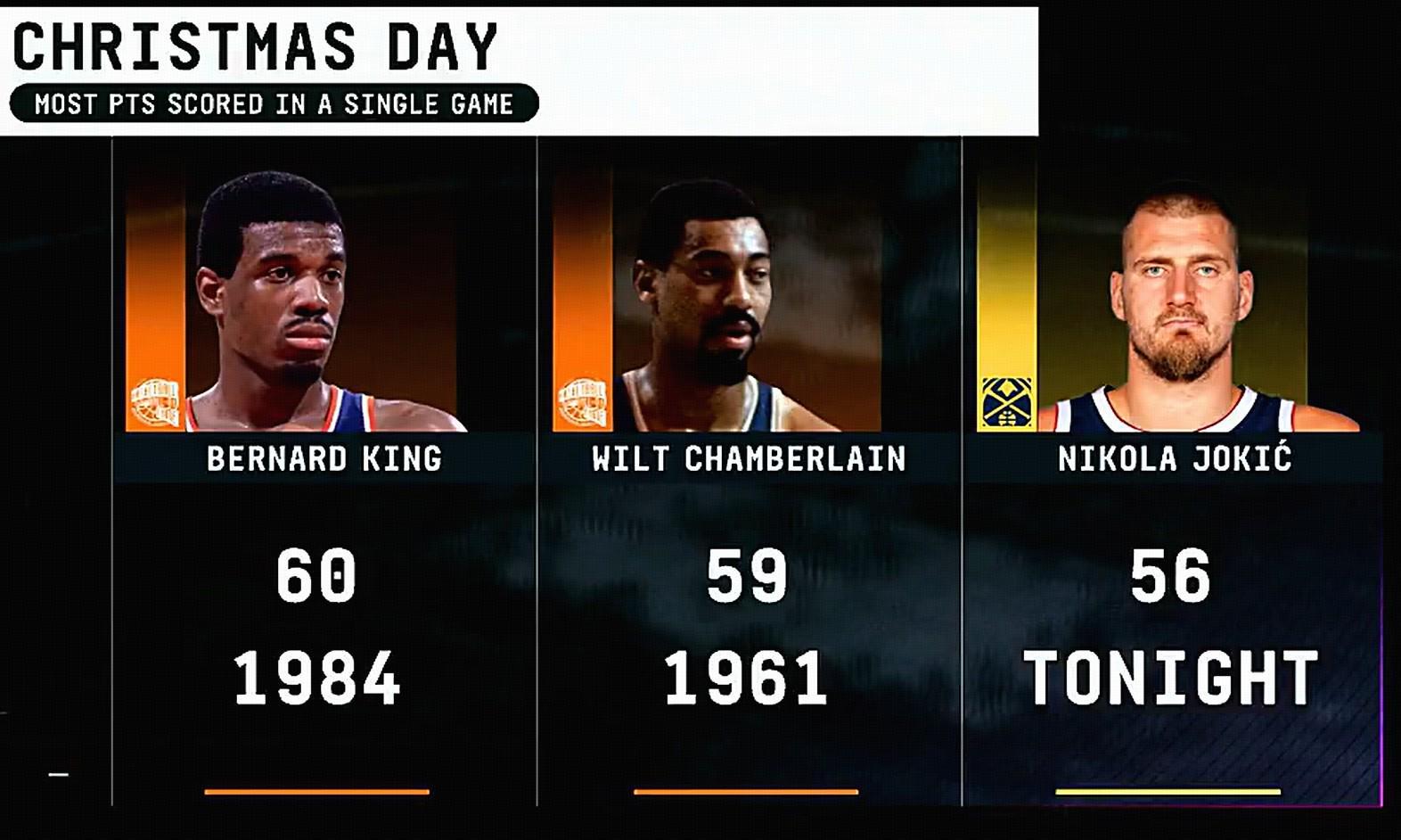 据统计,约基奇砍下的56分在圣诞大战的历史上能排名第三,仅次于伯纳德-金(60分)和威尔特-张伯伦(59分)。