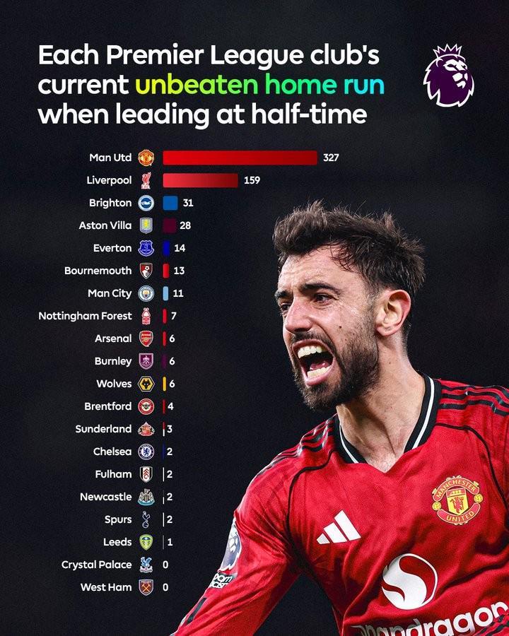 英超主场半场领先连续不败纪录:曼联327场居首,利物浦159场