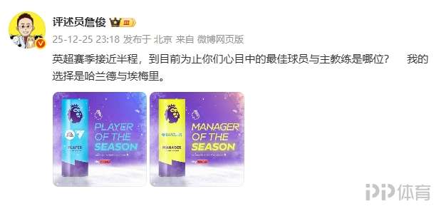 詹俊:英超赛季接近半程,到目前为止你们心目中的最佳球员与主教练是哪位?我的选择是哈兰德与埃梅里。